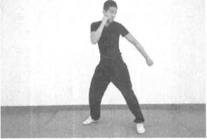 (一)撩拳1 左后撩拳动作要领左格斗势起。上体向右后转体两腿屈膝上体前俯略向内含胸。左拳向内经腹前向下从身体左侧下方向后上方撩出。左拳撩出后左肩向后顺肩拳心向内拳眼向下着力点为左拳轮右臂屈肘内收右拳置左下颌向左后目视左拳。(图7-1-13)要点向后撩拳时右脚掌蹬地左胯向左后拧头稍向下低两腿稍屈膝为腿法反击做准备°此拳也可以经体侧向后揣出或反臂直臂打出。向后揣出为后揣拳,反臂打出为反背锤。用掌撩出为后撩掌。2 右后撩拳动作要领右后撩拳要领与左后撩拳相同方向相反。
