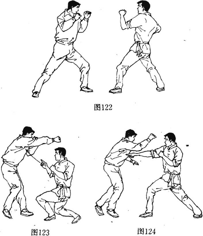 点打要领在技击对抗中(图122),对手发右锤攻我上盘如其锋甚锐且手上有硬功我不能以蛮力抵之应速下蹲避过敌锋芒(图123)。不待敌发起连续攻击我已气运右指猛力点向敌胸部期门穴而得手(图124)