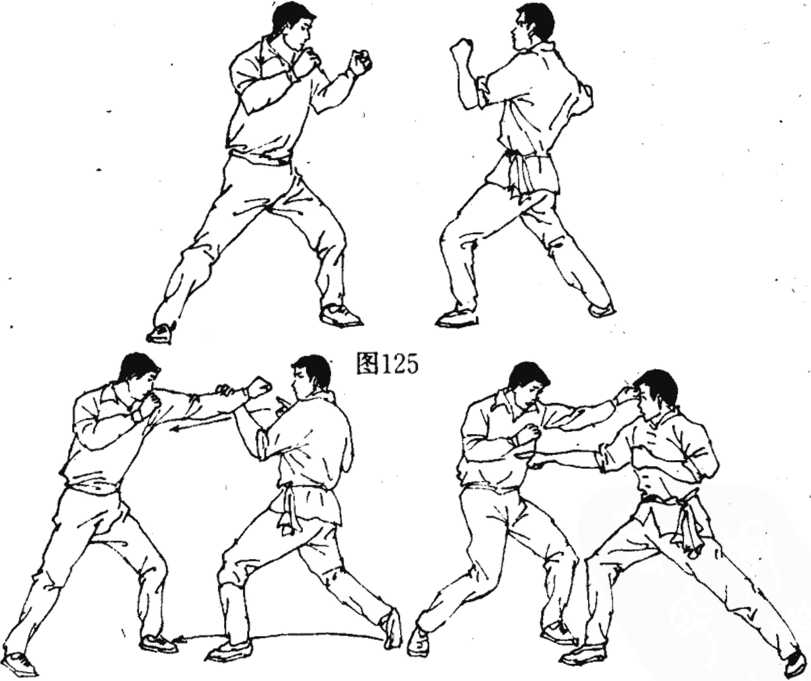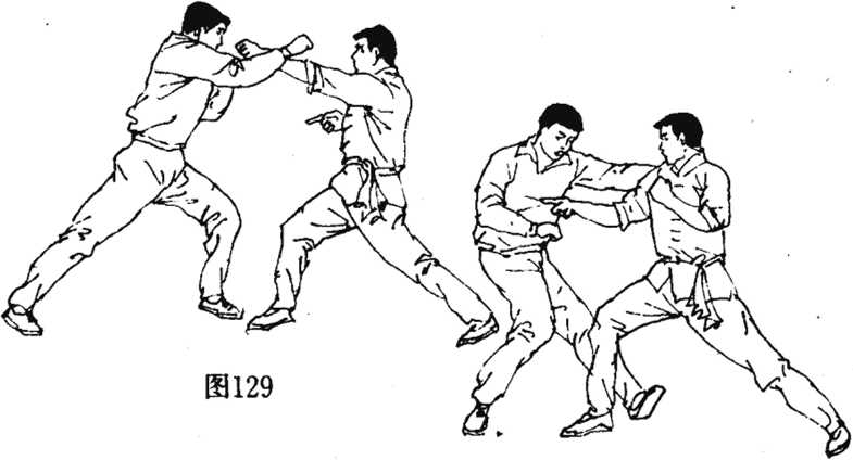 点打要领在技击对抗中(图125),对手上左弓步出左掌向我头部劈打我速挥左手截击其腕(图126),以卸其力不待敌收手速出右指猛点其肋下章门穴(图127)。