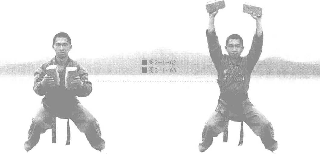 接上式双手持砖在胸前稍做调息。吸气收小腹呼气双手将砖向上推出两手保持上托状态吸气双手持砖收回置于胸前。意念吸气时意想丹田混元气由下丹田上升到中丹田(膻中穴)稍闭气呼气发力意念丹田混元气由手臂内侧贯注两手劳宫穴达到砖面。双手反复练习见图2-1-62、图2-1-63。要点马步要稳重心不能起伏托砖时呼吸和动作要协调一致。(7)第七式——收式自然站立循经拍打全身放松。南少林易筋经腾骨布气术-(1)功理功效