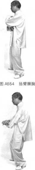 接前式重心向左腿转移身体右转右脚后撤一步面向西方。左学从卜向上,从左向右搭在右肩上,掌心朝内虎口朝上。(图554)(图554)