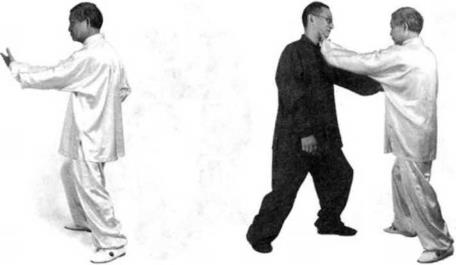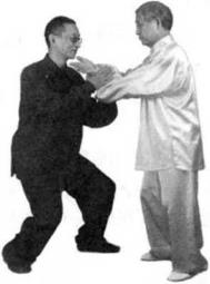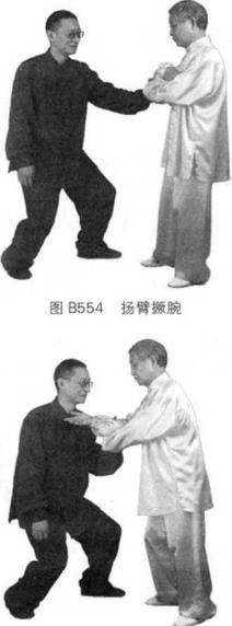 此时,我身后乂来一人用左掌打我的后背。我即转身移动右步扬起左手来撅他的左腕并以我右肘压住他的掌心和五指用双掌去叉他的喉咙、此时