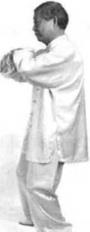 身向后坐重心向左腿转移,两小臂同时向内弧行旋转回收,两腕仍相搭右腕搭在左腕背上,两掌心都朝外,五指斜上。(图556)(图556)
