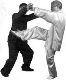 我正以中指刺他的喉头他提起右脚踢我的裆部。我即同身后坐左手卜落好似顺水摸鱼一样抓住了他的脚跟,扣我左脚向右方甩去。