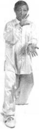方紧接着腰向右转左学顺时针旋转从左向腹膈前弧行移动并以掌变拳拳背向内虎口朝下至右拳向下垂直线约一拳距离止。(图413)(图413)