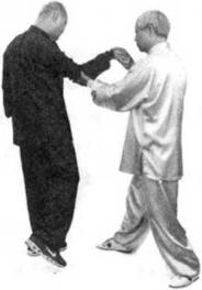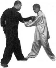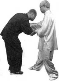 我右手叼住他的右腕由内向外卷曲并用我的左手封住他的肘部我腰向右转左掌前推右手内搬来撅掀他的肘部,使他右臂疼痛无法脱身然后我继续上托他的右肘,牵他左转和我面面相对,我即旋转右臂用右拳打他的颈后风府穴或翳风穴左臂旋转用左拳击打他的小腹或腰眼