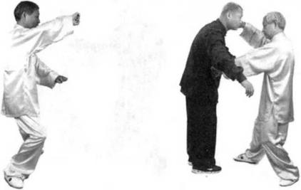 时右掌向右脚尖方向平行推出。(图411)(图411)