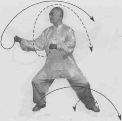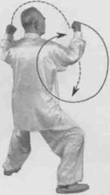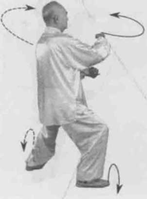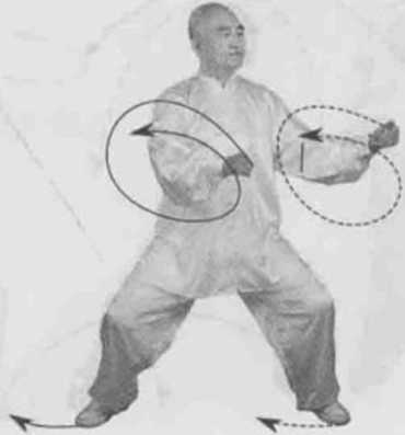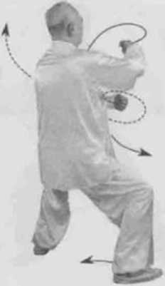 动作一身体快速右转胸向西南眼看左侧。左脚顺缠膝里合右脚逆缠膝里扣,重心偏右腿。左拳逆缠按转右拳逆缠按转。