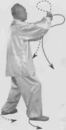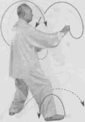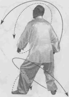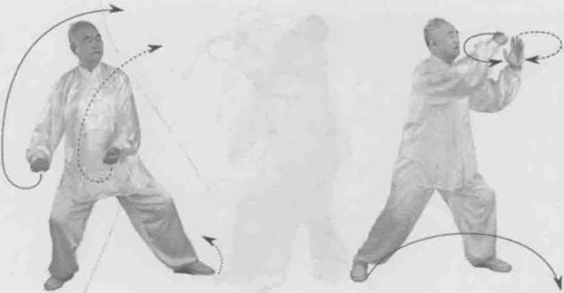 动作一身体快速右转胸向东北眼看左掌。左脚顺缠膝里合,重心偏左腿右脚逆缠膝里扣。左掌右拳双逆缠外开倒转,再双顺缠