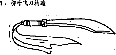 飞刀式样亦各不同。有单刃者有双刃者有如僵月形者。以其形式不同故发射方法亦因之而异。兹先述三刃飞刀盖称柳叶飞刀。此刀以其形似而得名。刀身长6寸柄长1寸7分。刀身上锐下丰其形完全与柳叶无异。两面皆有刃刃薄如纸。两面正中间各有隆起之脊。头完全尖锐如针。其刃与脊与剑相似。两面脊处最厚约2分。刀重约3两余。而刀柄亦以铁为之其重约4两许。刀身与刀柄相接处有刀盘。盘身较刀桁周围略大重约2两。统计每1飞刀重约10两左右刀柄末端缠以红绿