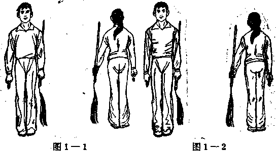 甲面向南并步站立左手持剑剑直立于左臂后剑尖朝上。右臂自然垂于身体右侧、右手成剑指。眼平视前方。乙动作与甲相同,惟方向相反。甲乙相距约3米前后相距中线一步(见方位图及图1一1)。