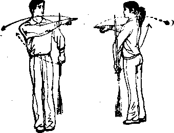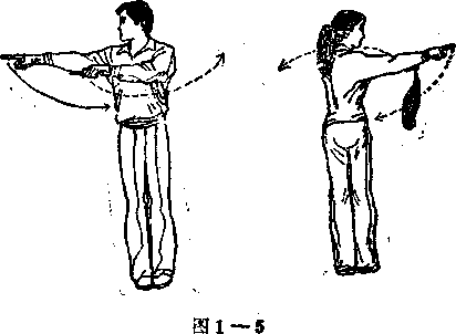 4甲右臂略向上抬起并向右平摆划弧至身体右侧手心向外高与肩平。同时左手持剑由下向右、向上摆起停于右肩前手心向下目视右手乙动作与甲相同(图1—5)