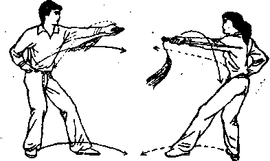 3甲右手由下向左、向上摆起手心向下高与肩平。目视对方。乙动作与甲相同(图1一4)