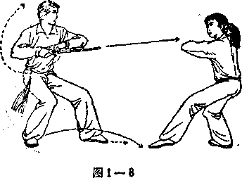 1甲左脚向前上步右脚随之跟上成并步。眼平视前方。乙动作与甲相同。甲乙同时动作上步后站在同一条中线上的两端(图—2)。