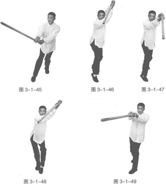 随半步成立身中正之势同时运棍向左上方横架后以棍头发力向前下方刺棍(图3-1-48、图3-1-49)。以上循环练习即可。