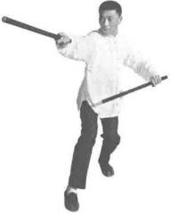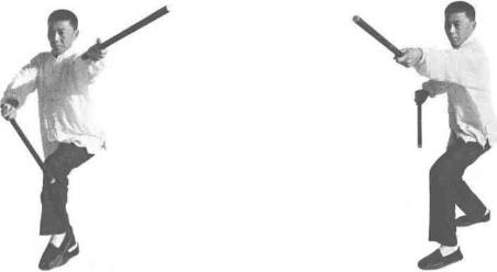 承上势。右足先向前踩进一步紧接着左脚过右脚向前踩出一步脚尖着地内扣15。右脚在后紧随半步同时右手持棍向右横拨左手棍由后向前方右侧横击身体成左手左足在前的顺势(图3-2、图3-2-5)。练至场地尽头可向右转身再继续进行练习。
