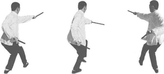 承上势。左脚先向前踩进一步紧接着右脚过左脚向前踩出一步脚尖着地内扣15。左脚在后紧随半步同时左手持棍向左横拨右手棍由后向前方左侧横击身体成右手右足在前的顺势(图3-2-2、图3-2-3)
