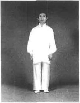 动作两脚成立正姿势,身体中正,两臂下垂于身体两侧手心向内,头自然正唇齿微合舌尖抵住上腭,二目平视(图4一1)。