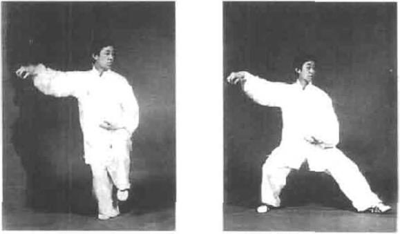 要求右腿支撑重心上下相合切忌弯腰凸皆。此动为合吸气。
