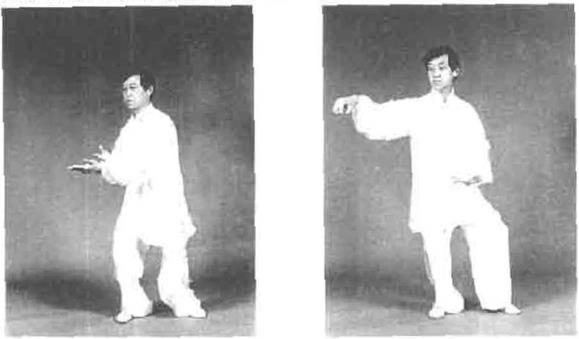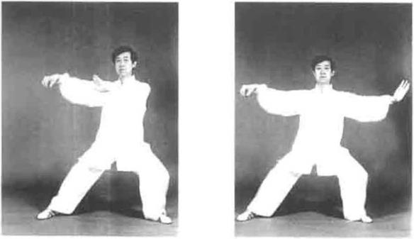 动作一接上势身体右转重心在右两手双顺缠右手里收,左手外转目视右前方(图2-221)