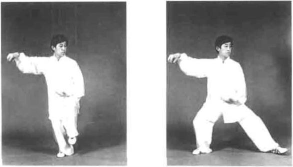 动作四接上势,重心在右腿左脚跟里侧着地向左侧铲地滑出脚尖上翘里合目视身左侧(图2—224)
