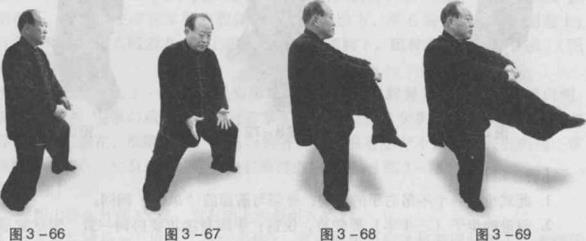 动作一右脚尖翘起,内旋45度朝向东南身体随即左转,正面朝东。右腿微下薄承受身体重心左腿提起大腿端平脚尖朝。同时两掌变握拳置于左膝盖两侧拳眼相对拳心朝下。眼向前方平视。(图3-68)