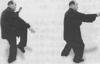 动作一右脚提起,向后(西)撒一步左脚提起迅速跟至右踝内侧脚尖着地同时左掌臂内旋弧形运至左膝内侧,赏心朝下,掌指朝右右掌弧形上运至右腰外120