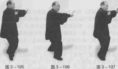 动作七左脚提起向左后方(西北)撤一步右脚提起迅速跟至左踝内侧脚尖着地同时双掌作弧形运动。左掌弧形运至左肩外侧掌心斜朝外掌指斜朝右右掌臂外旋弧形运至左肘内上侧掌心朝上掌指朝左。眼仍关注右前方。(图3-197)