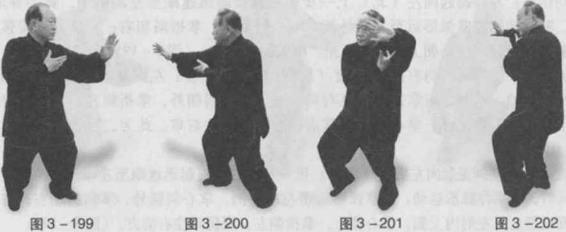 动作卜身体右转面朝西。右脚向右前方(西)上一步,左脚迅速跟至右踝内侧脚尖着地。同时右掌弧形运至右肩前方掌心朝前下掌指朝前上掌高与肩平左掌肾外旋弧形运至右肘内侧掌心朝右,掌指朝前(西)。眼神关注右掌变化。(图3-200)