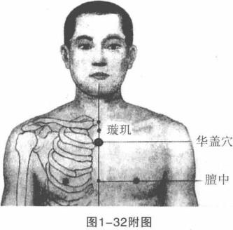 用法1敌方左脚前移步之际右脚跨上一大步右拳击打我方面部。我方迅疾后滑步避过敌拳锋芒之际沉身下坐成左虚步同时左掌棱向前上外拦敌右前臂。(图1-31)图1一312动作不停我方左掌贴住敌右臂向前推右脚跨上踏入敌方洪门右手凤眼捶击敌胸前华盖穴。(图1-32)穴位华盖穴属任脉。在胸部当前正中线上平第1肋间。在胸骨角上有胸廓(乳房)内动、静脉的前穿支布有第1肋间神经前皮支的内侧支。