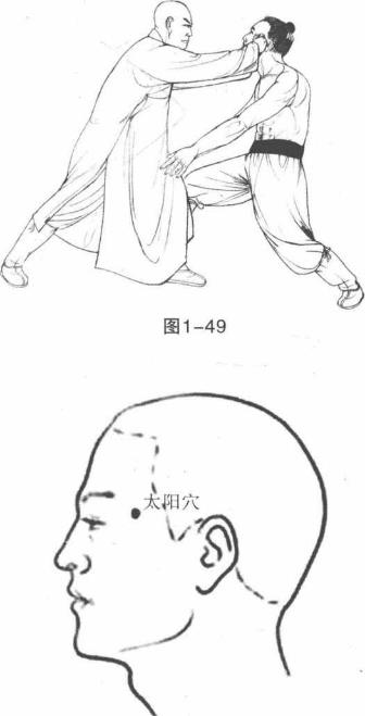 用法1敌方左脚前移步右脚向前方上一大步两掌向前插出攻击我方腹部。我方迅疾收拢左脚半步屈膝沉身成左丁虚步上身略前倾两掌向前下插用两前臂外侧格敌两前臂内侧阻截敌双掌插击。(图1-48)2动作不停我方双臂猛然向外抖劲左脚跨上一步于敌右脚内侧同时两掌变凤眼捶向前上划弧合击敌头部太阳、太阴二穴。(图1-49)穴位太阳穴(左太阳、右太阴)为经外奇穴。在耳廓前面前额两侧外眼角延长线的上方是武术死穴之一。现代医学证明打击太阳穴可使人短暂晕倒或造成脑震荡使人意识丧失。