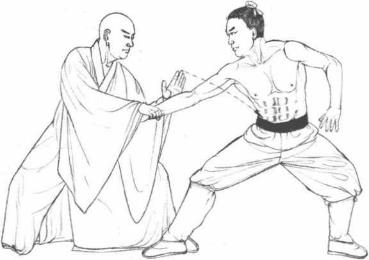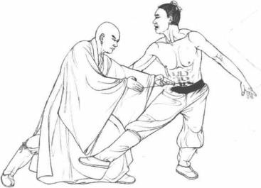 2随即我方左手剑指顺着敌方右前臂之上向前穿出戳击敌方右腹侧肚筋穴。(图3-24)