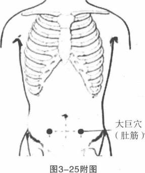 肚筋穴即大巨穴属足阳明胃经。位于人体下腹部从肚脐到耻骨上方画一线将此线五等分每份为1寸(即同身寸)。从肚脐往下两寸(即石门穴)再向左右2寸(约三横指宽)处即为大巨穴别名腋门穴、液门穴。