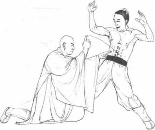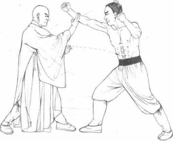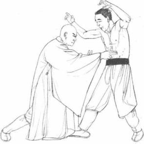 3 动作不停右手剑指紧跟而出戳击敌腹左侧吊筋穴。