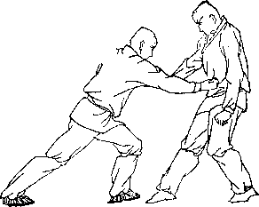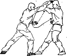 1甲上右脚用右手上抓乙的脸部乙必然用其左手上挑甲右手(图68)。2甲左手随即由下向上再挑乙的左手(名曰挑中挑)而甲右手抽回用中、食二指(或正拳)点打乙的气海穴(图69)。