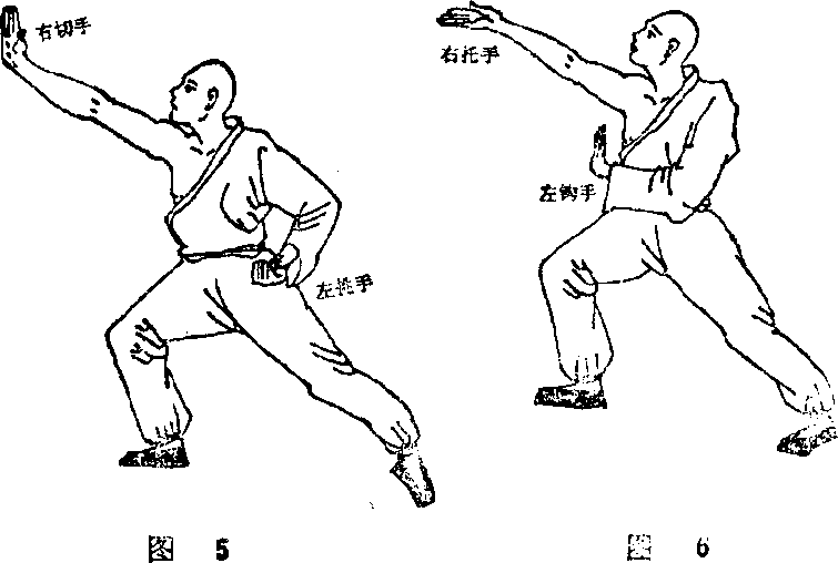 (3) 切手(又名斫挑手)(图5)此手有单切、双切之分。单切以一手挑开敌人来手以一手用力切敌身而使人倾跌。乃上部手法中之最稳而最实用之手法也。