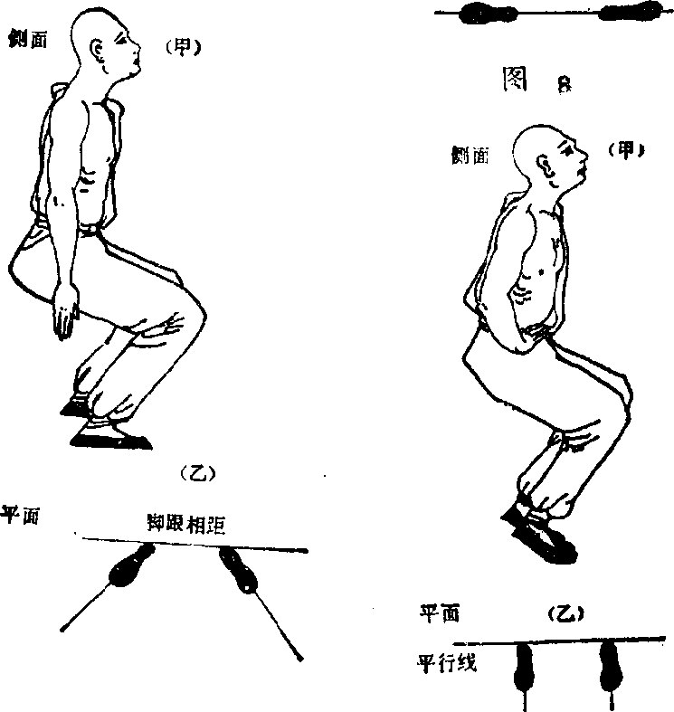 两足立成并行线两腿蹲下向前作跪式踵高举足趾着力。此步练足趾之弹力也。