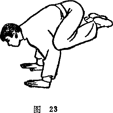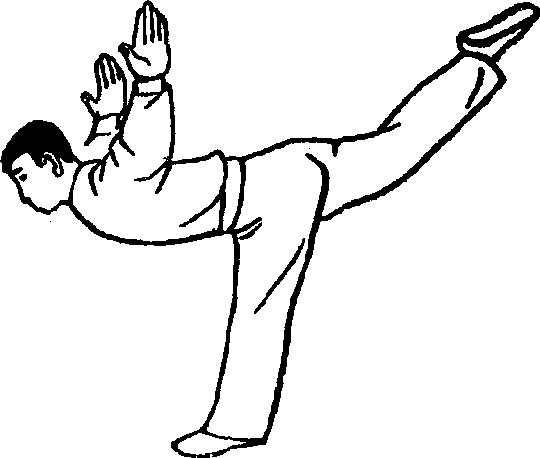 (1) 正立上身前俯右腿后伸脚尖绷直左腿支撑身体两手在两侧平伸(图21)。(2)左脚尖碾地身体向左旋转360。。(3)略停向右旋转360、连作数次换1右腿支撑身体再作数次。