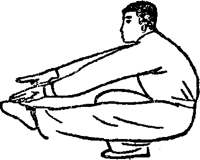 (1)正立右腿向身后左腿向身前徐徐贴地劈开右腿以腿前侧贴地脚尖绷直左腿以腿后侧贴地脚尖上翘上身竖直正对左腿。(2)双手向前扳住左脚上身前俯贴于左腿上头顶向左脚(图20)。(3)上身向一侧