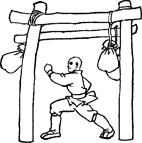沙包功(图19)为硬功外壮属阳刚之劲然刚柔互济比单恃刚劲更胜人一筹。练时先植木为架左右前后各悬沙包若干每包之重约五六斤包之高度与肩平。所悬之绳宜坚韧。人居架之中央踏定马步或弓步先用单拳击一沙包使之向外荡出待其荡回时更猛力击之务使手
