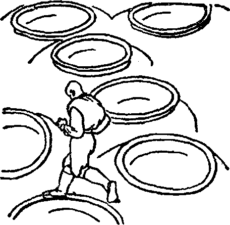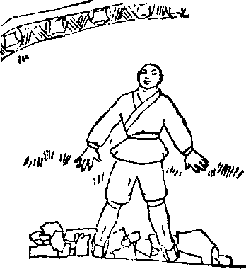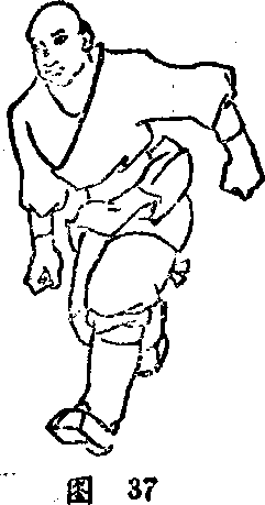 轻身术(图38),为软功内壮最不易学。盖以吾人百斤之体而欲使如蜂蝶之息枝飞燕之穿帘谈何容易。其练法与蹿纵术、飞行功、一线穿略同。初练时置七只巨缸满