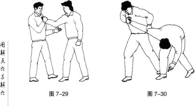 点穴法对方向前上步用右手抓住我胸前衣服时我立即用右手扣握住对方右手背与小指一侧(图7-29)。随即我右手向右方翻拧其手腕,身体右转同时我左手向上抓住其右肘关节上侧拇指掐住其手五里穴并向下按压使对方被我拿臂掐穴制住(图7-30)。