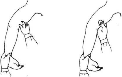 并向外拉起,伤者肘关节稍屈。医者将气运到右手食指食指对准穴位发气6?9分钟(图7-31)。