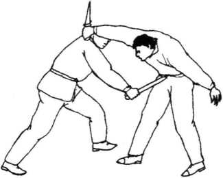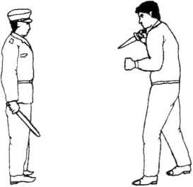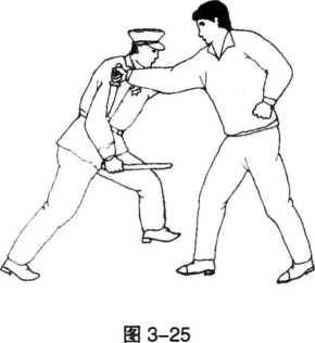 点穴法暴徒右手持匕首向我靠近时我右手持警棍准备防守与进攻(图3-24)当暴徒用匕首从上向下向我攻击时我左脚向左前方上步,身体向左侧闪防守上体稍前俯(图3-25)随即用警棍向前点击暴徒右急脉穴(图3-26)。