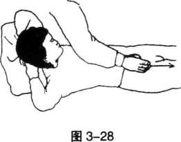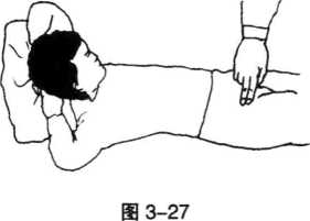 1 发气解穴法伤者仰卧医者站于其左侧将气运到右手食指和中指然后两指尖对准右急脉穴发气6-9分钟(图3-27)。