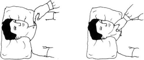 医者将气运到右手拇指,拇指按在穴位上沿经络向下、向右反复按推6?9分钟(图3-66)。要点伤者体、颈、头要正而放松。医者按推的力量要轻柔,速度需缓慢。图3-65 图3-66
