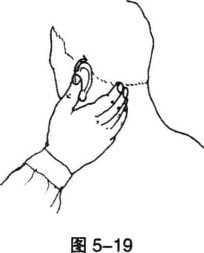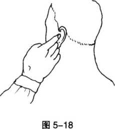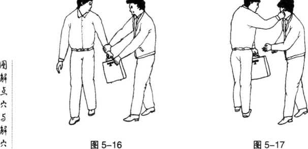 位置在面部听宫穴上方耳屏上切迹的前方张口有凹陷处(见图-3)点穴法歹徒从我身体左侧用右手抓住我左手腕用左手夺我左手中皮包时我左手握紧(图5-16),随即身体左转,随体转右手变金刚指手型向前、向左摆出用食指尖端点击歹徒左耳门穴(图5-⑺。解穴法1 发气解穴法伤者坐位,医者站于其左侧,将气运到右手食指,食指尖对准穴位发气9分钟左右(图5-18)。2 按摩解穴法医者将气运到右手拇指,拇指按在穴位上沿经络向耳上方反复按推6分钟左右(图5-19)要点意念将气贯到穴内与经络。