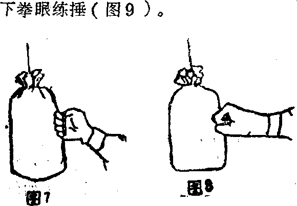 1眇袋练法可选用铁砂掌功夫的前二种练法仅将掌变为拳用拳面练砸(图7),用拳锋练冲(图8),用