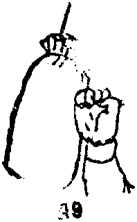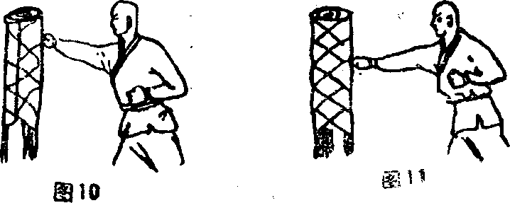 1)棉桩的福度一般是顶端与练功者的肩相平。棉桩共分上、中、下三个击把。上把平肩宜练闪拳(即举臂由外向内击拳心向内)(图10)中把平心宜练冲拳(即