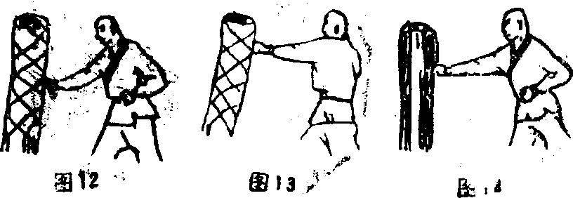 打。早晚各行一次每次150发共计390发。练至三个月增至500发持续半年弃去棉层续练打木桩(图14)。次数和方法同棉桩练至一年后改练拳击木墩。
